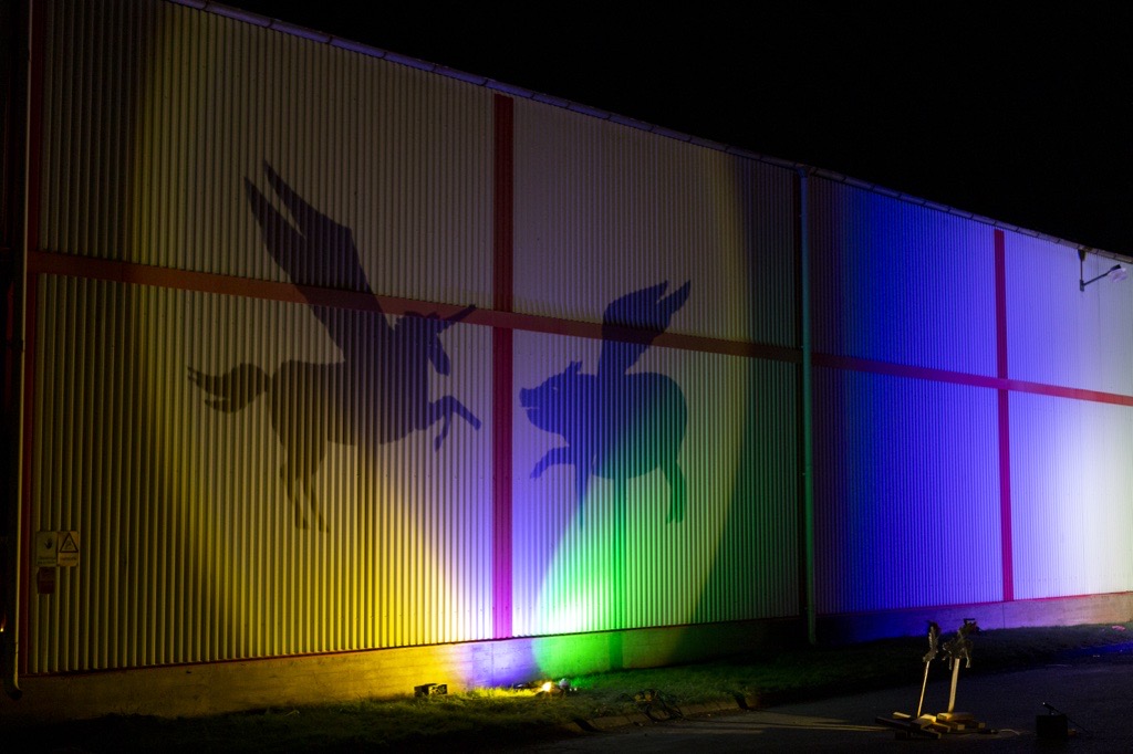 Lampsken i starka färger och stora skuggfigurer visades upp Norrahammars bruks fasader under Septemberljus.