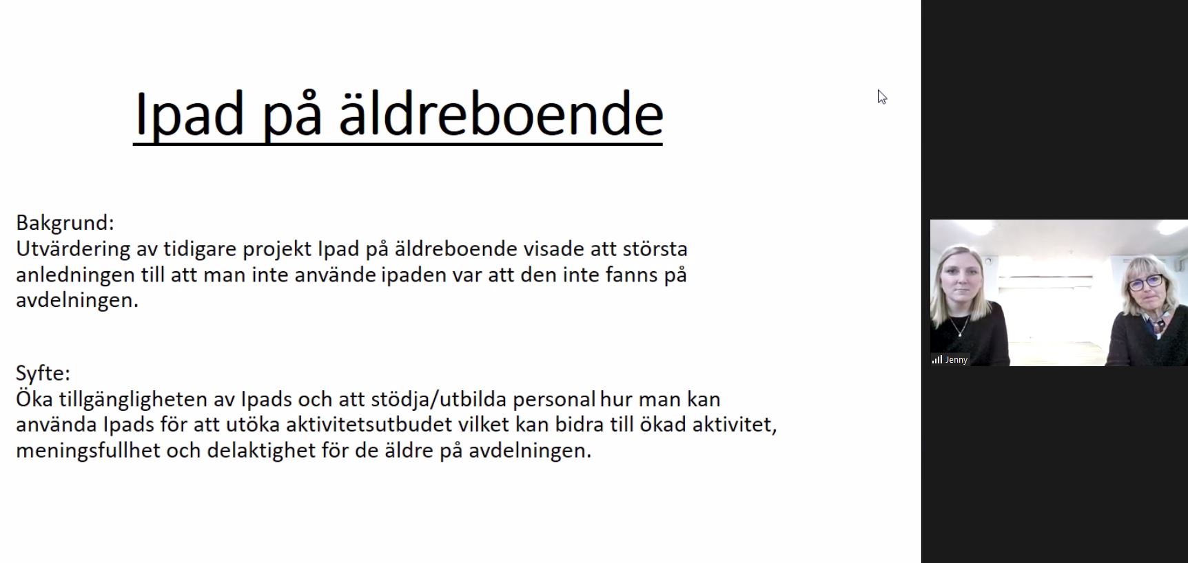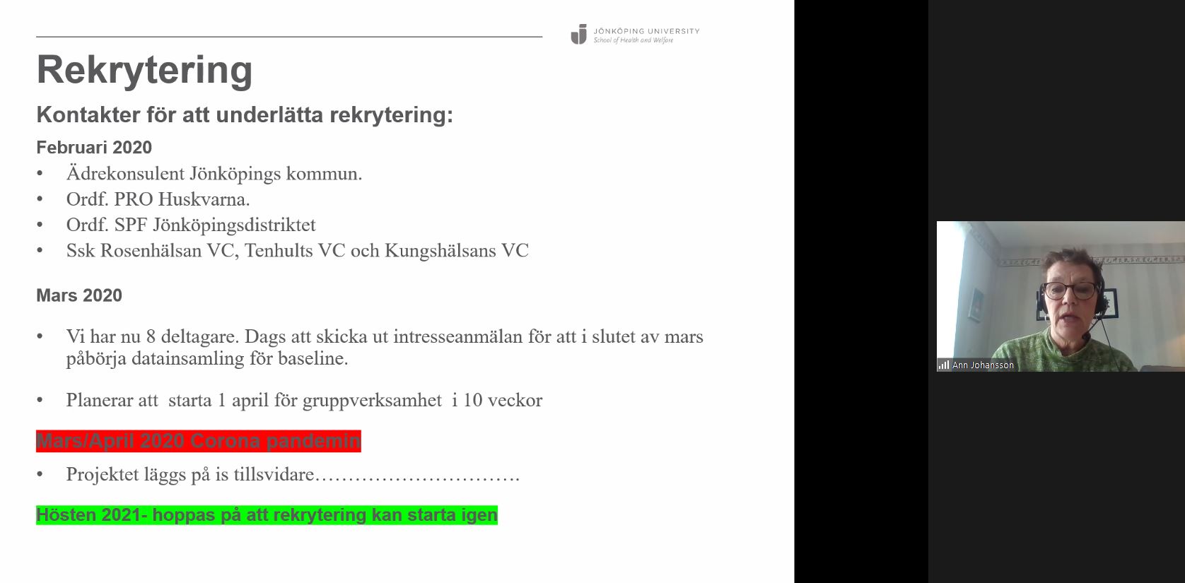 The ceremony, which usually begins with a joint lunch and then presentations from both this year's and last year's scholarship recipients, was, this time, held as a digital event. The Dean at the School of Health and Welfare, Marie Ernsth Bravell, who is also chairman of the foundation, began the afternoon with a brief overview of the scholarship process and announced that the project "Elderly in safety" would be awarded SEK 150,000.