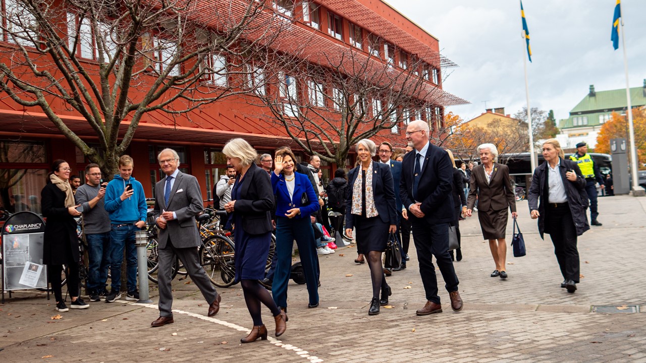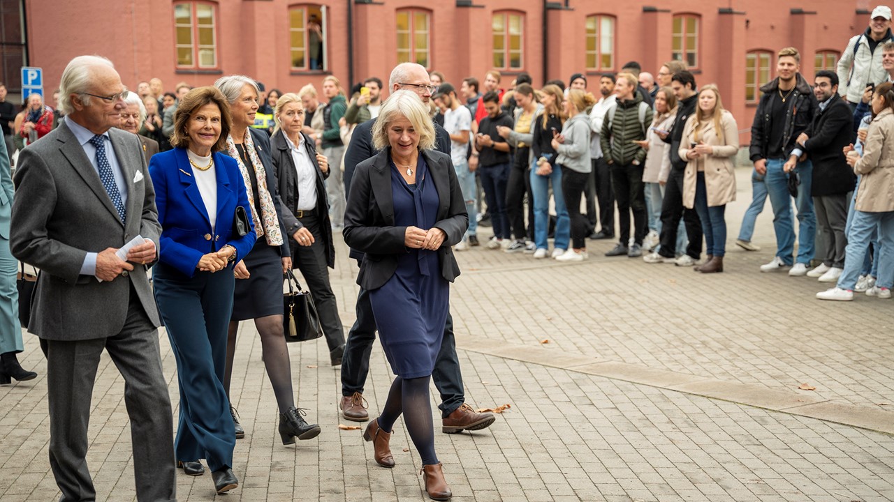 The royal couple was greeted by President Agneta Marell when they arrived to campus.